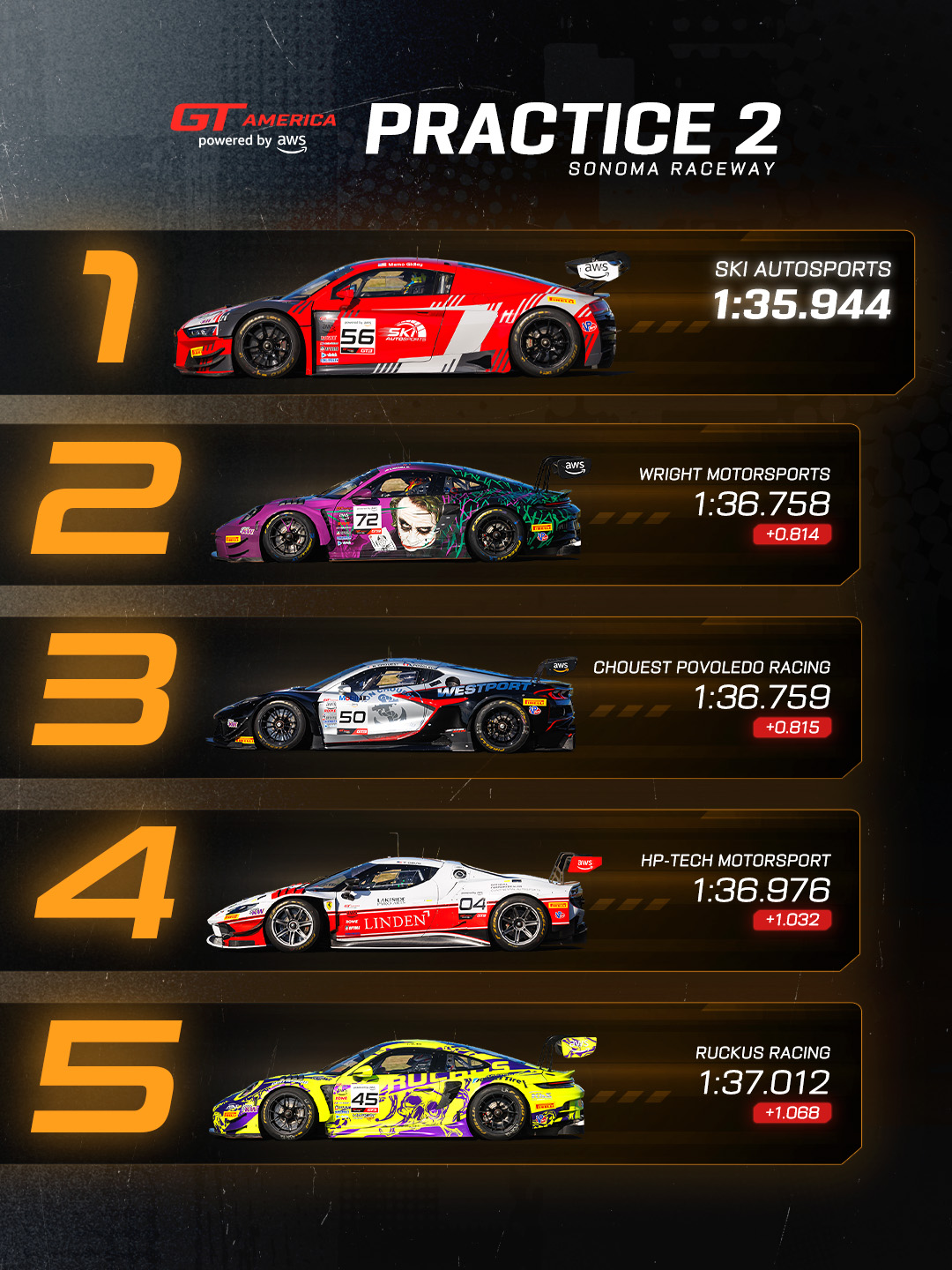 Practice 2 is complete for GT America powered by AWS at Sonoma Raceway, and the field stayed tightly packed as teams continued to build speed ahead of the opening races of the 2026 season. California-native Memo Gidley put SKI Autosports on top in the No. 56 Audi R8 LMS GT3 EVO II with a best lap of 1:35.944, while Dave Musial Sr. and Ross Chouest followed closely behind in second and third. Tony Davis and Scott Blind completed the overall top five, while David Lecko once again led the Cup class and Craig Lumsden paced GT4 as the Sonoma weekend fully kicked off.