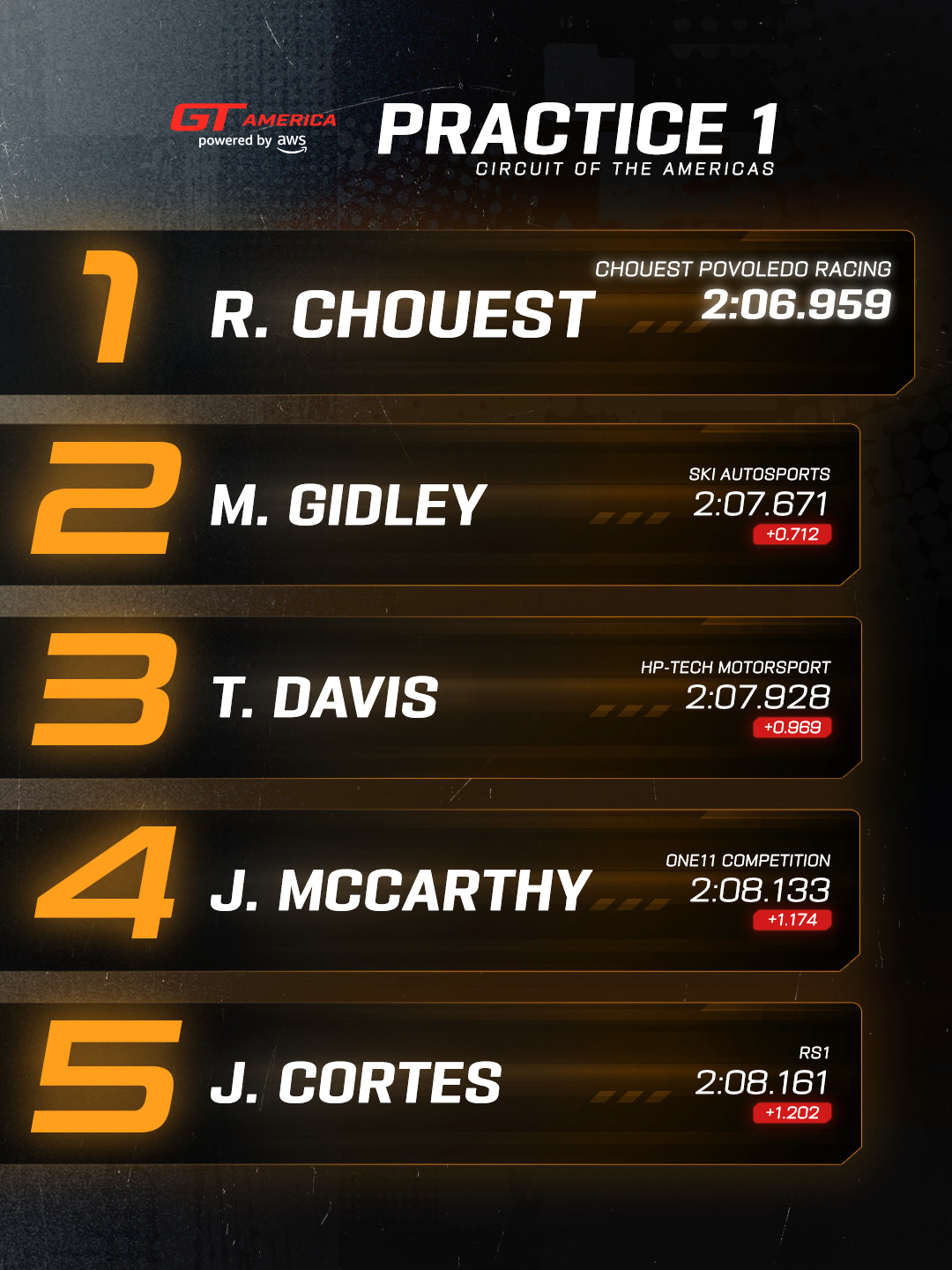 It was a bright and sunny afternoon at Circuit of The Americas as the GT America powered by AWS field took to the fast and flowing track for their first practice session of the weekend. The rising temperatures matched the setting as the championship battles heat up. Ross Chouest put in a fast final flying lap time of 2:06.959 on board his No. 50 Chouest Povoledo Racing Chevrolet Corvette Z06 GT3.R to secure the fastest time in Practice 1. Championship leader Memo Gidley followed in second in the No. 56 SKI AUTOSPORTS Audi R8 LMS GT3 EVOII, with Tony Davis slotting into third with his No. 04 HP-TECH Motorsport Ferrari 296 GT3 EVO. The top five in the SRO3 class was further completed by Jason McCarthy in the No. 115 One11 Competition Ferrari 296 GT3, and Joel Cortes in the No. 19 RS1 Porsche 911 GT3-R (992).